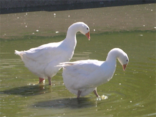 | 萊茵鵝原產于德國的萊茵河流域,經法國克里莫公司選育,成為世界著名肉毛兼用型品種。萊茵鵝的特征是初生雛鵝背面羽毛為灰褐色,從2周齡開始逐漸轉為白色,至6周齡時已為全身白羽。在法國和匈牙利,通常以郎德鵝做父本,與該品種的母鵝交配,用雜交鵝生產肥肝;或以意大利鵝做父本,與該品種雜交,用以生產肉用仔鵝。萊茵鵝肉鮮嫩,營養豐富,口味獨特,是深受人們喜愛的食品。萊茵鵝羽毛的含絨量高,是制作高檔衣被的良好原料。 一、外貌特征 全身羽毛白色,喙、脛與蹼均為橘黃色。初生雛鵝絨毛灰白色,隨日齡增長,毛色逐漸變淺,至6周齡時全身都是白色羽毛。 萊茵鵝的體型與中國鵝有明顯不同,它具有歐洲鵝的體態特征,前額肉瘤小而不明顯,喙尖而短,頸較粗短,背寬胸深,身軀呈長方形,當站立或行走時,體軀與地面幾乎成平行狀態,與中國鵝昂首挺胸的雄姿截然不同。 二、生產性能 1、肥育性能 仔鵝8周齡體重可達4.0~4.5千克,肉料比為1:2.5~3.0,屠宰率為76.15%,活重為5.45千克,胴體重為4.15千克,半凈膛率為85.28%。成年公鵝體重5~6千克,母鵝4.5~5千克。純種的肥肝重400克左右,與郎德鵝雜交后平均肥肝重可達500克以上。 2、繁殖性能 母鵝開產日齡在210~240天,生產周期與季節特征和氣候條件有關,正常產蛋期在1~6月末,年產蛋50~60枚,平均蛋重在150~190克。萊茵鵝公母配比為1:3~4,種用期為4年。種蛋受精率為75%,受精蛋孵化率為80%~85%。雛鵝成活率高,達99.2%。萊茵鵝能在陸上配種,也能在水中配種。 三、品種利用 萊茵鵝適宜大群飼養,引入我國后作為父本與國內鵝種雜交生產肉用雜種仔鵝,雜種仔鵝的8周齡體重可達3~3.5千克,是理想的肉用雜交父本。 |