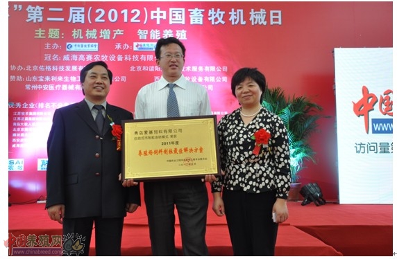 青島愛基自助式冷制粒連鎖模式榮獲“2011年度最佳解決方案獎” ----養殖場飼料制粒最佳解決方案 第十屆(2012)中國畜牧業展覽會于2012年5月18-20日在南京召開。中國畜牧協會在博覽會期間,舉辦首屆畜牧機械行業優秀評選活動,評選2011年中國畜牧機械行業優秀企業與優秀人物,展示當年畜牧機械行業發展的最新成果。 評選活動由中國農業大學畜牧工程學分會、畜牧工程委員會的專家團主持,評選內容包括2011年度畜牧機械行業的十強企業、十大杰出人物、最具影響力企業、最佳解決方案、最具創新力產品。 江蘇牧羊集團、江蘇正昌集團、Big Dutchman等大型企業集團分別獲獎。 外商獨資青島愛基飼料公司研發的自助式冷制粒連鎖模式無可置疑地榮獲“養殖場飼料制粒最佳解決方案”大獎。汪堯春博士代表公司,由中國農業大學畜牧工程學分別會、畜牧工程委員會李保明理事長授予獎牌與獎狀。