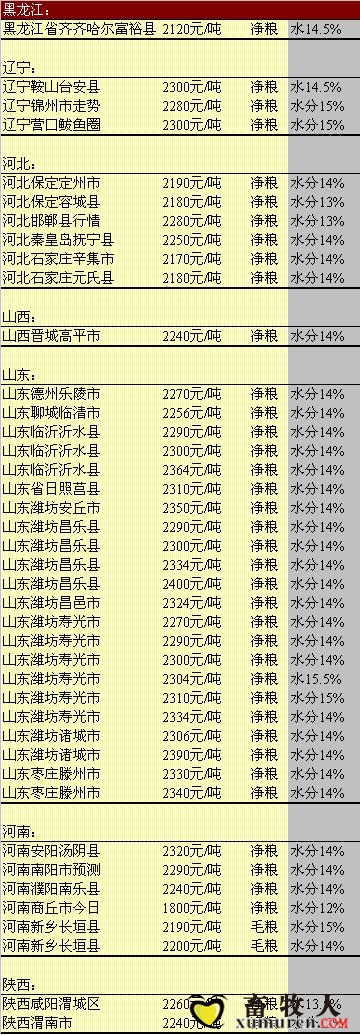 黑龍江: 黑龍江省齊齊哈爾富裕縣 2120元/噸 凈糧 水14.5% 遼寧: 遼寧鞍山臺安縣玉米價格 2300元/噸 凈糧 水14.5% 遼寧錦州市玉米價格走勢 2280元/噸 凈糧 水分15% 遼寧營 ...
