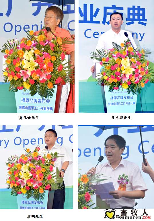 播恩集團劉賢政先生為本次慶典主持人,中國畜牧業協會副會長喬玉峰先生、農業部畜牧業司飼料處副處長李大鵬先生、華南農業大學博導副校長廖明先生、“夢之隊”代表重慶優寶生物技術有限公司董事長孟懷旺博士、四會市養殖協會曾騰飛會長、創何美中國南區銷售總監趙冰洋先生等分別發表了熱情洋溢致詞。