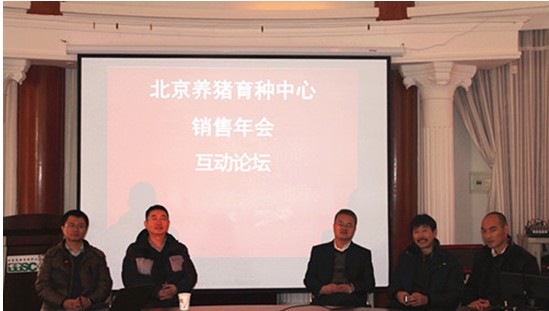 2014年1月6-7日,北京養(yǎng)豬育種中心召開了2013年銷售年會(huì)。 會(huì)議對(duì)中心2013年銷售工作進(jìn)行匯報(bào)分析總結(jié); 就種豬營銷方略,種豬企業(yè)開展網(wǎng)絡(luò)營銷理念和實(shí)施方法,養(yǎng)豬中心新技術(shù)、新工藝、美系豬性能以及新美系豬的上市等方面做培訓(xùn)、互動(dòng)論壇交流。