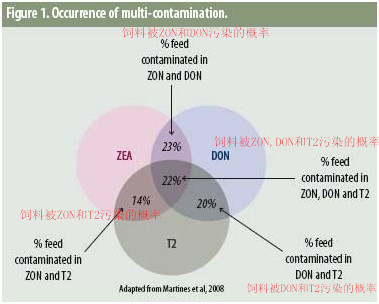 在一種原料中含有多種污染的概率是很高的,如圖1所示。其實(shí),適合一種霉菌發(fā)育的環(huán)境也同樣適合其他霉菌,自然也會(huì)產(chǎn)生多種不同類型的霉菌毒素。研究表明,霉菌毒素污染低也可以產(chǎn)生毒性作用,這種效應(yīng)可超過(guò)教科書上所描寫的:這就是協(xié)同效應(yīng)。最近的一項(xiàng)由Isabelle Oswald(2011)進(jìn)行的研究表明在腸道DON和伏馬毒素之間存在協(xié)同效應(yīng)。她推斷,當(dāng)DON破壞了上皮細(xì)胞時(shí),伏馬菌素阻礙了上皮細(xì)胞的更新。