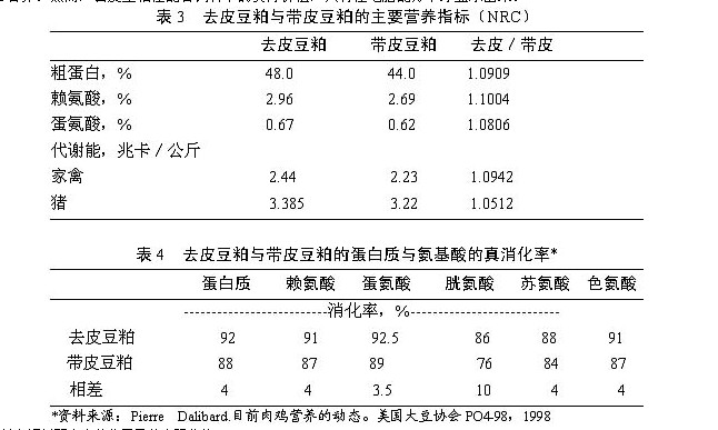 去皮豆粕及其在飼料配方中的價值 去皮豆粕在飼料工業(yè)中的使用量將逐年上升。本文從大豆加工工藝開始,對去皮豆粕的生產(chǎn)、質(zhì)量標準、營養(yǎng)價值及其在飼料配方中的應用加以討論。 去皮豆粕的由來 大豆(制油)加工工藝經(jīng)歷了由機械壓軋到浸出法制油、由帶皮浸出到去皮浸出的過程。在美國,50年代開始出現(xiàn)浸出制油工藝,最初是帶皮浸出,隨后轉(zhuǎn)向去 皮浸出。目前,在美國加工的大豆,絕大部分采用的是先去皮、后浸出的工藝,機軋加工大豆估計不超過1%。螺旋軋油機主要用于浸出前初軋花生、棉籽等高含油種籽。我國現(xiàn)有兩家大豆加工廠采用了先去皮、后浸出的加工方法,生產(chǎn)去皮豆粕。 先去皮、后浸出,既是制油工藝的需要,也是為了更好地利用豆粕。豆皮主要由種皮組成。種皮含油僅1%,含蛋白8.8%(表l)。加工中分離出的豆皮約占大豆重量的8%,占大豆體積的10%。去皮后浸出,可以使加工廠產(chǎn)量提高10%以上。