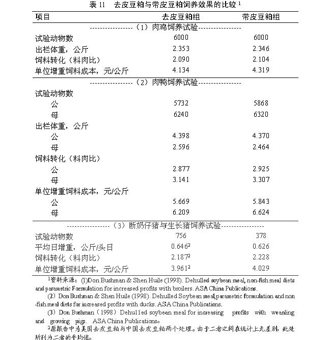 應當指出,以上對有關去皮豆粕的價值的分析是相當保守的。這是因為筆者并未將氨基酸的可消化性或有效性(表4)考慮在內(nèi)。其次,對用現(xiàn)代制油技術所生產(chǎn)的去皮豆粕質(zhì)量的高度穩(wěn)定性這一優(yōu)勢也未包括在內(nèi)。 最后,去皮豆粕對飼料加工所能帶來的效益也不應忽視。例如,前面所舉的肉雞帶皮豆粕配方中的油脂添加量達到了2.65%(表6)。這在一般的制粒設備、 工藝條件下,往往會導致顆粒飼料的質(zhì)量(穩(wěn)定度,durabililty)下降。而去皮豆粕配方中只含0.8%的外加油脂(表6),在相同條件下,將會制成質(zhì)量(穩(wěn)定度)比帶皮豆粕配方為高的顆粒飼料。此外,當要求飼料粉碎粒度很細的情況下,例如在加工擠壓熟化的魚飼料或?qū)櫸镲暳蠒r,粉碎去皮豆粕的電耗將 明顯低于帶皮豆粕。 飼養(yǎng)試驗結(jié)果 1997年,美國大豆協(xié)會以肉雞、鴨和豬為對象動物,對去皮豆粕和帶皮豆粕在生產(chǎn)條件下進行了對比飼養(yǎng)試驗。在這批試驗中,去皮豆粕的蛋白含量定為47%,帶皮豆粕蛋白含量定為44%。去皮豆粕與帶皮豆粕的價格比按蛋白含量比設定為 1.068。帶皮豆粕配方為現(xiàn)用配方(對照)。去皮豆粕配方與對照配方唯一不同之處為按一定的氨基酸/代謝能比調(diào)整玉米與豆粕在配方中的比例。由于去皮豆粕的蛋白、氨基酸和代謝能的含量比帶皮豆粕高,豆粕在配方中的用量比對照配方相應減少,玉米用量相對增高,從而導致去皮豆粕配方的能量濃度比對照高出 0.1兆卡/公斤左右。至于飼料成本,在試驗當時所設定的價格關系下,去皮豆粕配方反而比對照稍低。表11簡要歸納了上述試驗結(jié)果。 參試肉雞共12,000只。結(jié)果表明,去皮豆粕日糧組的出欄體重提高了0.3%[(2.353-2.346)/2.346],每公斤增重的飼料消耗降低了0.7%[(2.104-2.09)/2.104],每公斤增重的飼料費用降低了4.3%[4.319-4.134]/4.319]??倲?shù)為24160 只肉鴨的飼養(yǎng)試驗結(jié)果表明,去皮豆粕組的出欄體重,公鴨提高了6.4%,母鴨提高了5.4%;每公斤增重的飼料消耗,公鴨降低了1.6%,母鴨降低了 5.0%;每公斤增重的飼料費公鴨降低了3.0%,母鴨降低了6.3%。豬的飼養(yǎng)試驗(總頭數(shù)1134)結(jié)果是,去皮豆粕日糧組的日增重提高了3.2%, 每公斤增重的飼料消耗降低了1.8%,每公斤增重的飼料費用降低了1.7%。三種動物、三批試驗的結(jié)果完全一致。 上述試驗的去皮豆 粕的相對價格是按兩種豆粕的蛋白含量關系確定的。按此價格關系計算的飼料原料成本,能量和其他營養(yǎng)水平高的去皮豆粕配方反而略低于帶皮豆粕配方。由于目前國內(nèi)市場上去皮與帶皮豆粕的價格比有可能超過蛋白含量比,同樣的去皮豆粕配方的飼料原料成本有可能不低于,甚至略高于相應的帶皮豆粕配方。然而,只要去皮 豆粕在配方中的實際價格或影子價格高于市場價格,就一定能用去皮豆粕配成營養(yǎng)水平比相應的帶皮豆粕配方高而飼料原料成本相同的飼料。相同的飼料原料成本,更高的營養(yǎng)水平,這是去皮豆粕在飼料配方中可以發(fā)揮的另一優(yōu)勢。(選自飼料工業(yè),作者:熊易強 博士,美國大豆協(xié)會) |