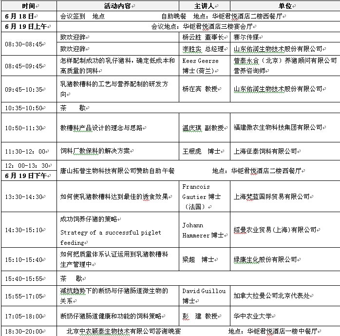 (第三輪通知) 尊敬的各企事業(yè)單位領(lǐng)導(dǎo)、各位同行: 教槽料作為飼料中的高端產(chǎn)品,從發(fā)展伊始就受到了各方的關(guān)注。目前,隨著養(yǎng)殖企業(yè)規(guī)模的擴(kuò)大,教槽料的市場(chǎng)覆蓋率也在逐年提升,但是相對(duì)于歐洲90%以上的教槽料覆蓋率,我國(guó)教槽料市場(chǎng)僅為20%左右,因此我國(guó)未來(lái)的教槽料市場(chǎng)潛力巨大。其次,雖然養(yǎng)殖規(guī)模逐年擴(kuò)大,但是仔豬腹瀉問(wèn)題依然比較嚴(yán)重,呈現(xiàn)較高的發(fā)病率和死亡率,教槽料的價(jià)值被迅速挖掘,必將有更多的企業(yè)使用優(yōu)質(zhì)的教槽料。再次,隨著2013年《禽畜養(yǎng)殖污染防治條例》的公布,環(huán)保問(wèn)題越加受到重視,高效養(yǎng)殖必將成為行業(yè)主流,也將促進(jìn)教槽料的使用。 在成功舉辦兩屆國(guó)內(nèi)外教槽料發(fā)展高峰論壇后,2014年國(guó)內(nèi)外教槽料發(fā)展高峰論壇應(yīng)業(yè)界人士的要求,將于2014年6月再次召開。屆時(shí),賽爾傳媒將邀請(qǐng)國(guó)內(nèi)外動(dòng)物營(yíng)養(yǎng)權(quán)威專家和飼料行業(yè)精英人士再次同聚一堂,分享國(guó)際最前沿、最新資訊和研究成果,并針對(duì)國(guó)內(nèi)目前養(yǎng)殖狀況,共同探討教槽料的生產(chǎn)、發(fā)展方向,推動(dòng)我國(guó)教槽料產(chǎn)業(yè)發(fā)展! 打造教槽料行業(yè)技術(shù)高端交流會(huì) 主辦單位: 賽爾傳媒 承辦單位:山東佑潤(rùn)生物技術(shù)股份有限公司 特別贊助單位:福建傲農(nóng)生物科技集團(tuán)有限公司 晚宴贊助單位:北京中農(nóng)穎泰生物技術(shù)有限公司 協(xié)辦單位: 牧羊有限公司 加拿大拉曼公司北京代表處 綠康生化股份有限公司 上海征泰飼料有限公司 美國(guó)大豆出口協(xié)會(huì) 上海梵藍(lán)國(guó)際貿(mào)易有限公司 上海源耀生物股份有限公司 上海杰隆生物制品股份有限公司 紹曼農(nóng)業(yè)貿(mào)易(上海)有限公司 支持單位: 美國(guó)嘉吉公司 廣西揚(yáng)翔股份有限公司 北京四方紅飼料科技有限公司 唐山拓普生物科技有限公司 廣州天科生物科技有限公司 浙江匯能動(dòng)物藥品有限公司 廣州市拓肽生物蛋白質(zhì)有限公司 濱州中牧飼料科技有限公司 福建省金農(nóng)威飼料有限公司 北京華瑞同升生物科技有限公司 山東惠爾佳生物有限公司 中化云龍有限公司 珠海天香苑生物科技發(fā)展股份有限公司 福州正陽(yáng)飼料有限公司 北京雙河正源科技有限公司 清華大學(xué)繼續(xù)教育學(xué)院農(nóng)業(yè)產(chǎn)業(yè)培訓(xùn)中心 支持媒體: 《賽爾飼料工業(yè)》 《賽爾養(yǎng)豬市場(chǎng)》 《飼料工業(yè)》 《飼料科技》 《中國(guó)飼料添加劑》《飼料廣角》 《新飼料》 《南方飼料快訊》 南方飼料信息網(wǎng) 賽爾畜牧網(wǎng) 畜牧人網(wǎng) 中國(guó)飼料工業(yè)信息網(wǎng) 中國(guó)飼料行業(yè)信息網(wǎng) 廣東省飼料行業(yè)信息網(wǎng) 博亞和訊網(wǎng) 中國(guó)畜牧飼料電視網(wǎng) e搜易購(gòu) 豬E網(wǎng) 愛畜牧 新牧網(wǎng) 愛豬網(wǎng) 中國(guó)飼料在線 中國(guó)際畜牧網(wǎng) 中國(guó)水產(chǎn)頻道 中國(guó)養(yǎng)殖網(wǎng) 種豬信息網(wǎng) 中國(guó)畜牧在線 一、參會(huì)對(duì)象: 飼料集團(tuán)及飼料企業(yè)總經(jīng)理、技術(shù)總監(jiān)、采購(gòu)經(jīng)理等中高層負(fù)責(zé)人,養(yǎng)殖集團(tuán)及相關(guān)行業(yè)中高層負(fù)責(zé)人 二、會(huì)議規(guī)模: 600人 三、會(huì)議時(shí)間: 2014年6月18日~20日 2014年6月18日全天報(bào)道 四、會(huì)議地點(diǎn): 華鉅君悅大酒店 地址:廣州市 花都區(qū) 迎賓大道399號(hào) 五、會(huì)議日程 五、會(huì)議 嘉賓簡(jiǎn)介: 印遇龍?jiān)菏?/STRONG> 印遇龍,動(dòng)物營(yíng)養(yǎng)學(xué)家,1997年獲英國(guó)貝爾法斯特女皇大學(xué)博士學(xué)位。現(xiàn)任中國(guó)科學(xué)院亞熱帶農(nóng)業(yè)生態(tài)研究所研究員。 長(zhǎng)期從事“豬氨基酸營(yíng)養(yǎng)代謝與調(diào)控”的研究,在其基礎(chǔ)研究和轉(zhuǎn)化應(yīng)用做出了突出貢獻(xiàn),率領(lǐng)團(tuán)隊(duì)發(fā)表發(fā)表研究論文300余篇(一區(qū)和IF>3.0 SCI論文90多篇),主編中英文專著4部,參編11部。 豬氨基酸的營(yíng)養(yǎng)功能的基礎(chǔ)研究獲2013年湖南省自然科學(xué)一等獎(jiǎng),“仔豬腸道健康調(diào)控關(guān)鍵技術(shù)及其在飼料產(chǎn)業(yè)化中的應(yīng)用”獲2010年國(guó)家科技進(jìn)步二等獎(jiǎng),“畜禽氮磷代謝調(diào)控及其安全型飼料配制關(guān)鍵技術(shù)研究與應(yīng)用獲2008年國(guó)家科技進(jìn)步二等獎(jiǎng),“豬飼料養(yǎng)分回腸末端利用率及有效氨基酸需要量的研究獲1996年國(guó)家科技進(jìn)步三等獎(jiǎng),“豬雞營(yíng)養(yǎng)參數(shù)及配方新技術(shù)研究”獲1997年國(guó)家科技進(jìn)步二等獎(jiǎng)。2013年當(dāng)選中國(guó)工程院院士。 Simon Tibble 博士 Simon 1985年從利茲大學(xué)動(dòng)物生理和營(yíng)養(yǎng)專業(yè)畢業(yè),畢業(yè)后在一個(gè)專業(yè)幼畜動(dòng)物營(yíng)養(yǎng)飼料公司做營(yíng)養(yǎng)師,主要負(fù)責(zé)客戶的技術(shù)支持和產(chǎn)品開發(fā)。六年后,他加入SCA擔(dān)職豬營(yíng)養(