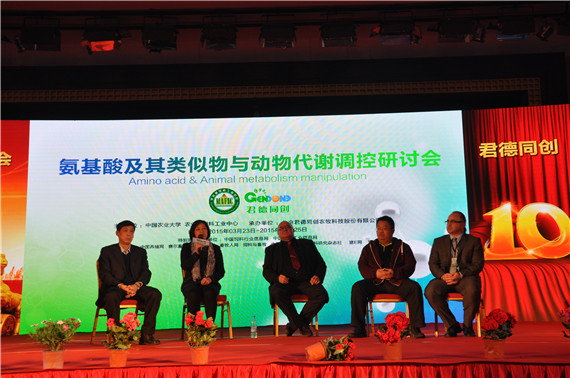 2015年3月24日由農業部飼料工業中心主辦,北京君德同創農牧科技股份有限公司承辦的《氨基酸及其類似物與動物代謝調控研討會》以及新產品發布會在北京美麗的溫都水城湖灣酒店隆重舉行,同時隆重舉辦“君德同創十周年華誕”慶典活動。中國工程院院士、農業部飼料工業中心主任李德發,中國工程院院士、中國科學院亞熱帶農業生態研究所研究員、國家生豬產業技術創新戰略聯盟理事長印遇龍,加拿大紐芬蘭紀念大學教授、加拿大營養學會主席.Rob Bertolo,南京農業大學動物科技學院教授朱偉云,亞太中慧集團農牧事業部技術品控總經理張述興,山東農業大學教授林海,獸醫學博士E.Wayne Johnson,君德同創董事長楊立彬,大中型飼料企業、集團公司、養殖一條龍企業負責人、高校和科研單位老師、研究生,以及行業媒體代表等300多人出席了此次研討會。畜牧人網站受邀參加此次盛會,并作會議報道。與會代表重點圍繞功能性氨基酸營養、腸道菌群與動物氨基酸利用、肌酸研究進展等展開熱烈討論,交流新認識、新思想、展示新技術、新產品。 會議的開幕式由農業部飼料工業中心副主任譙仕彥主持,開幕式上李德發院士和楊立彬董事長致開幕詞,李院士首先代表農業部飼料工業中心對胍基乙酸新產品發布會和公司十周年慶典表示熱烈祝賀,他表示一個新產品的研發是非常艱難的,并給新產品推向市場,更是一段非常艱苦的歷程,企業在前進的過程中,要加強合作。并衷心希望君德同創團隊要緊密團結一起,他也相信君德同創在楊立彬董事長的領導下,一定會走向更加輝煌的明天。 楊立彬董事長首先代表君德同創108位員工對大家蒞臨參會表示熱烈的歡迎。君德同創成立十周年,用七年的時間專注"氨基酸及其類似物與動物代謝調控"研究,研發出國家二級新產品胍基乙酸(肌源TM)并獲得了農業部頒發的飼料添加劑新產品證書和新產品生產許可證和產品批準文號。最后他感謝農業部飼料工業中心,那里是君德同創成長的搖籃,他并在臺上鞠躬感謝恩師李德發院士的諄諄教誨。 楊立彬致歡迎詞 開幕式過后,上午的研討會正式拉開帷幕,由林海教授主持,首先是印遇龍作《如何發揮功能性氨基酸等的潛能》主題報告,他從功能性氨基酸的概念、功能性氨基酸與胎兒/新生動物生長、功能性氨基酸與細胞內蛋白質周轉 、功能性氨基酸與免疫功能等做了詳細的降解,并對功能性氨基酸今后研究方向做了展望。他指出色氨酸、亮氨酸、精氨酸等功能性氨基酸對提升動物生長性能、改善動物情緒和行為、以及提升動物免疫機能具有十分重要的調控作用。他認為,在低蛋白日糧,植物性蛋白替代動物性蛋白的營養配方中,功能性氨基酸及其代謝產物更為重要,動物性蛋白肌酸含量較高,在植物性蛋白日糧中補充胍基乙酸能起到同樣的效果。 印遇龍院士 接下來是南京農業大學的朱偉云教授做作《腸道菌群與動物氨基酸利用》主題報告,她談到,消化道營養代謝是機體營養代謝的前提 ,是營養素高效利用、腸道健康、機體整體健康的保障!胃腸道消化代謝首過腸道代謝--營養素利用效率、代謝物排放 。腸道中的營養素,是宿主也是微生物的營養。機體對營養素的需求,也依賴于腸道微生物,人的飲食習慣依賴于腸道微生物對營養素需求。最后她總結了腸道微生物菌體AA組成變化規律及氨基酸代謝的關系,如菌體天冬、丙、谷、亮氨酸對日糧蛋白水平響應敏感,隨豬日齡增加,蛋白水平對菌體氨基酸影響更大,菌體AA占總糞AA比例 :仔豬 1-5%;生長、肥育豬 13-25%,日糧EAA/NEAA,影響回腸微生物菌體EAA/NEAA,但不影響糞樣菌體EAA/NEAA,回腸、糞便菌體AA中, >10%: Asp, Leu, Glu,5%~10%: Gly, Ala, Val, Ileu, Phe組、酪、蛋、半胱、絲占總氨基酸比例較低。腸道微生物對不同氨基酸的代謝需求和利用需求不同,不同腸道部位的微生物對氨基酸的代謝特點不同,小腸微生物代謝非支鏈的必需氨基酸,對BCAA代謝有限,與小腸細胞只代謝BCAA,形成協同互作機制。 中慧農牧的品控總經理張張述興作《原料營養素在肉雞產業鏈中的精準使用》,他從配方模型、原料特性、工藝生產變革等展開,詳細闡述了原料營養素在肉雞上的精準使用。如配方模型要用到的原料:玉米、小麥、高粱、大麥、木薯、豆粕、油脂等的屬性及質控要點,紅高粱要注意單寧的問題,用泡水45分鐘能快速鑒別摻假玉米蛋白,重點介紹液體原料的添加使用方法,如油脂、液體防霉劑、水、液蛋、液體膽堿、液體乳化劑、糖蜜、液體賴氨酸、液體抗氧化劑、液體調味劑等,并現場演示了液體原料如何添加,如給豆油、乳化劑、水添加一起,飼料不容易發霉。并提出了工藝生產變革必定是自動化液體原料添加,精準營養,標準化、自動化、減少人為操作是未來生產效益發揮的空間 ,噸袋、散裝原料及成品。最后他總結了精準營養是一項系統工程,需要配合營養、完美的工藝、飼料安全 ,熟悉法規的重要性來實現的。 3月24日下午的研討會13:30準時開始,由來自南京農業的朱偉云教授主持,加拿大紐芬蘭紀念大學教授、加拿大營養學會主席Rob Bertolo先生作了《肌酸的合成與代謝》的主題報告,他從肌酸的概念、合成、來源、與氨基酸的關系、新生期肌酸代謝、組織肌酸代謝等做了詳細的講解,最后他總結體內肌酸的合成造成體內多種營養素的供給,如蛋氨酸,精氨酸,