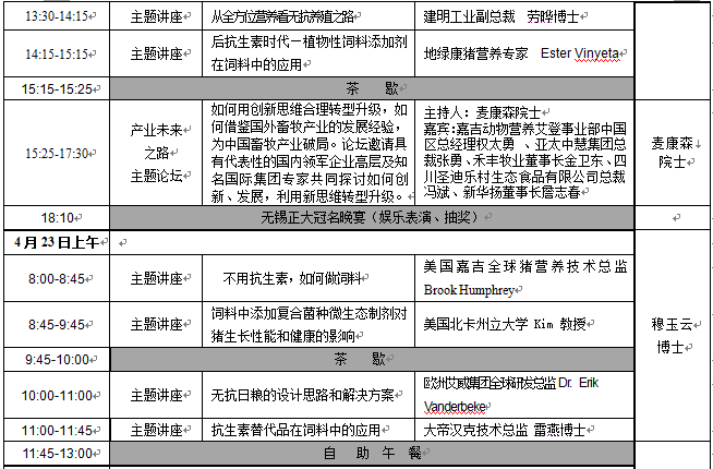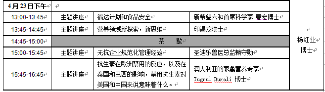 太陽鳥·畜牧產業無抗發展大會 邀請函(第四輪通知) 主辦單位:《飼料工業》雜志社 會議人數:500人 時 間:2015年4月21-23日 地 點:中國·南京 維景國際大酒店(★★★★★) 協辦單位:中糧集團/嘉吉動物營養事業部 贊助單位:新華揚集團 四川圣迪樂村 比利時AVEVE集團 美國建明工業 湖北海宜生物 奧地利地綠康 安琪酵母 龍力生物 大帝漢克 上海漢聯生物 美國大豆出口協會 奧特奇 支持單位:新希望六和、通威股份、亞太中慧集團、禾豐牧業、福建傲農、無錫華諾威、遼寧威蘭、北京中農牧、北京科為博、上海杰康諾、上海歐耐施、長沙興嘉、上海源耀、布勒(常州)、西班牙樂達、成都美溢德生物、漳州康龍電子、上海美農、臨沂正能量、無錫耐特、湖北浩華生物、深圳英威歐聯、奧邁科技 晚宴贊助:無錫正大畜禽有限公司 午宴贊助:上海沃迪自動化裝備股份有限公司 茶歇贊助:杭州誠緣生物科技有限公司 特別鳴謝:CCTV7農業頻道 CCTV4中國新聞欄目 支持媒體:中國飼料工業信息網 中國飼料行業信息網 中國養殖網 愛畜牧 博亞和訊網 中國畜牧飼料電視網 e搜易購農牧網 畜牧人網站 中國飼料添加劑信息網 《中國飼料》 《飼料科技與經濟》 《飼料廣角》《飼料研究》《飼料博覽》《現代畜牧獸醫》 《養豬》 《新飼料》 《養殖與飼料》 《中國禽業導刊》《中國畜禽種業》《新農業》《國外畜牧學豬與禽》《飼料科技》 《中國動物保健》《東北飼料信息》《賽爾傳媒》 《廣東飼料》 天地經緯農業品牌咨詢機構 艾格農業 【會議目的】 早在1992年瑞士就禁止使用飼用抗生素,2006年1月1日起歐盟禁止對動物飼料中使用抗生素,2014年起美國食品藥物管理局公布一份行業指導性文件,計劃用3年時間禁止在牲畜飼料中使用預防性抗生素。 無抗生素添加,已經成為發達國家對未來畜牧產業發展的一項共識,“無抗”也已經成為中國畜牧產業發展的必由之路。《飼料工業》雜志社應行業發展的需求,舉辦首屆“太陽鳥·畜牧產業無抗發展大會”,將邀請行業領導及國內外頂級學術專家共襄盛會,華山論劍,共同探討當前國內外最前沿的科技與創新解決方案,為行業未來的發展獻計獻策。集聚行業智慧、探討科技成果、交流創新技術、分享成功經驗,讓科技促進綠色健康。以期靈光閃耀,惠及民生!此次會議必將引發畜牧產業對“無抗發展”新的思考與共鳴! 一、會議主題:讓科技流動起來 二、會議時間:2015年4月21-23日 三、會議地點: 中國·南京 維景國際大酒店(★★★★★) 地鐵2號線,明故宮站1號出口即是,南京市中山東路319號。 (注:地鐵2號線可直接到達南京會展中心。) 四、會議日程表: 【組委會聯絡處】 太陽鳥·畜牧產業無抗發展大會組委會 地 址:沈陽市皇姑區金沙江街16號6門(《飼料工業》雜志社) 會議負責人:李春娟13691124678 會議聯系人:劉敏躍 13082416062 孟玲18602450265 報名電話:024-86276127 86394669 86276137 報名傳真:024-86276127 報名信箱:77581069@qq.com 【會務費標準】 1、會務費標準:2200.00元/人(包含晚宴、自助餐費、聽課費、資料費、抽獎資格、會刊雜志。注:住宿費用自理) 2、匯款交費: 帳 號:3301009009264054261 開戶行: 工行皇姑支行 戶 名:遼寧省農牧業機械研究所有限公司