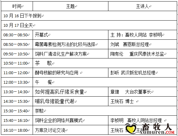 以技術走在前列 以創新再造輝煌 以適應借勢發展 2014年全國飼料企業由9000家降到6000家,近3000家將退出十幾年、幾十年為之奮斗、熱愛的飼料業。 飼料行業處境艱難,農業部提高飼料生產許可條件,企業間整合加快。應對新形勢,全省飼料工業轉型升級,大型企業做強做大,中小企業做特做精,努力打響河南品牌。 此消彼長 落后者消,領先者長 要在競爭中立于不敗之地,必須全面提升自己,打造無法復制的核心競爭力。畜牧業己由規模增長進入價值增長的新常態,這是行業發展過程自然中的必然,價值增長必須從:產品提升、產品安全、養殖者獲利、消費者滿意等諸多方面在產品研發,添加劑優化、組合和應用等全面提升,領跑產生價值。 畜牧人 為畜牧 畜牧人網創立于2003年,一直致力于打造畜牧服務平臺,開辦專家論壇,搭建動物營養平臺,開通技術交流QQ群。本會以"新產品,新技術,新方案"為主題,一線配方師、品控精英的實戰交流;醍醐灌頂的專家觀點聆聽后的茅塞頓開、恍然大悟將給您帶不一樣的感受! 一、組織單位 主 辦:畜牧人網站&畜牧人雜志 協 辦: 內蒙古金河動物藥業有限公司 山東格蘭德生物科技有限公司 賽恩斯(北京)儀器有限公司 武漢新宏璣生物科技有限公司 福建深納生物工程有限公司 二、時間和地點 酒店:信息賓館(河南省鄭州市金水區文化路與儉學街交叉口向西500米路北信息賓館) 時間:2015年10月17日(16日下午14:00報到) 三、參加對象 總經理、技術總監、質管部經理、配方師、技術服務專家等。 附:畜牧人全國巡回研討會(鄭州)站日程表: 四、專家介紹 王統石 獸醫學博士 畜牧人網站創始人。常年奔走于養殖一線, 專注蛋白質營養研究,擅長母仔豬料的配制技術。 自主研發的“乳豬教槽料”已獲國家專利。 電話:13385888882 QQ:42924583 微信號:wangtongshi 章健 廣州大臺農飼料有限公司總經理 曾為多家著名飼料企業高管,對中國養豬行業有深刻的認識。 劉斌 賽恩斯(北京)儀器有限公司總經理 多年從事食品安全檢測工作,與國內80%的乳品企業中心化驗室有過合作,近年來專注霉菌毒素檢測方法的研究,陸續為嘉吉、大北農、澳亞現代牧場等國內大型飼料、養殖企業提供霉菌毒素檢測產品及服務,在霉菌毒素檢測方面積累了豐富的經驗。 陶有倫 重慶民泰香料化工有限責任公司技術總監 專業從事分析化學和微生物研究進30年,主持開發了國內飼料添加劑行業多項優質產品,并在飼料企業清潔化生產領域有特殊貢獻。 彭昕 宏璣酵母集團 農牧事業部總經理 1995年畢業于西南大學榮昌校區(原四川畜牧獸醫學院)畜牧獸醫師范本科。農學學士 2007年中國人民大學MBA三期班畢業 1995年-2000年任職臺灣統一企業四川統一飼料油脂有限公司職位至技術課課長,負責配方設計、技術服務 2001年-2007年 廣東溢多利股份有限公司江西區域經理、湖北區域經理、動保事業部總經理 2006年創立武漢普樂美動物科技有限公司 2011年創立武漢新宏璣生物科技有限公司 2014年— 宏璣酵母集團農牧事業部總經理,武漢新宏璣生物科技有限公司總經理,負責宏璣酵母集團農牧事業全球運營。