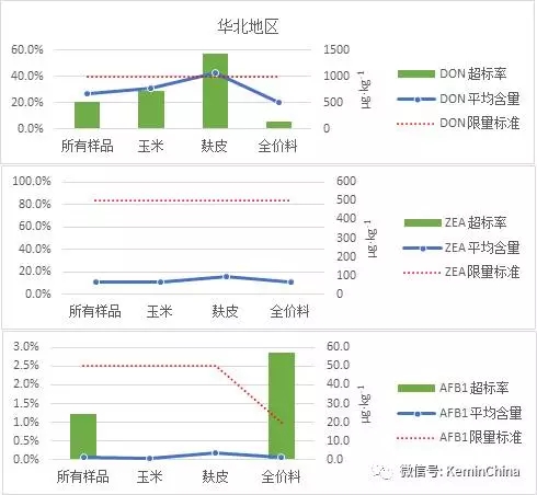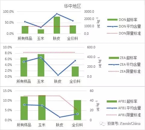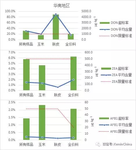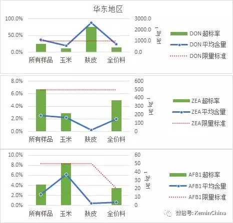 2016年,從北京、福建、安徽、山東、廣東、湖南等20個省市收集839份飼料及飼料原料,檢測了其中對畜禽生產影響較大的黃曲霉毒素B1、玉米赤霉烯酮和嘔吐毒素含量。結果顯示,黃曲霉毒素B1普遍污染較輕,玉米胚芽粕有個別樣品超標;蛋白粉和玉米胚芽粕中玉米赤霉烯酮污染較為嚴重;各類樣品嘔吐毒素污染水平都較高,以DDGS、麩皮、面粉、小麥污染最為嚴重。 將這20省市分為華南、華北、華東、華中等區域,我們對其結果進行了統計和分析,不同地區3種霉菌毒素污染情況結果如下: 華北地區 華北地區飼料及飼料原料共82份樣品中,麩皮樣品嘔吐毒素污染嚴重,超標率達57.1%,平均含量1066.8μg/kg,玉米中嘔吐毒素平均含量為777.2μg/kg,超標率為28.9%;全價料有個別樣品出現黃曲霉毒素超標的情況,但污染情況較輕;飼料及各類飼料原料中玉米赤霉烯酮均無超標(圖1)。 圖1 華北地區3種霉菌毒素污染情況 華東地區 華東地區共檢測飼料及飼料原料405份,其中嘔吐毒素污染最為嚴重,全價料和玉米中3種霉菌毒素均有個別樣品超標,且嘔吐毒素超標的樣品較多,玉米赤霉烯酮和黃曲霉毒素B1污染程度較為輕微;麩皮嘔吐毒素超標非常嚴重,超標率高達75%,且樣品嘔吐毒素平均含量達到2626μg/kg,麩皮中玉米赤霉烯酮和黃曲霉毒素B1沒有超標且污染程度輕微(圖2)。 圖2 華東地區3種霉菌毒素污染情況 華南地區 華南地區檢測飼料及飼料原料樣品共147份,各類樣品受嘔吐毒素污染較為嚴重,其次為玉米赤霉烯酮。全價料和玉米中嘔吐毒素超標率均在20%左右,平均含量在1000μg/kg左右,污染情況相對嚴重,玉米赤霉烯酮和黃曲霉毒素B1的超標率均在5%左右,且平均含量較低,污染程度輕微;麩皮嘔吐毒素超標率高達88.9%,平均含量4524.5μg/kg,污染情況非常嚴重(圖3)。 圖3華南地區3種霉菌毒素污染情況 華中地區 華中地區檢測飼料及飼料原料共149份,其中嘔吐毒素污染最為嚴重,其次為黃曲霉毒素B1。全價料中嘔吐毒素超標率為37.1%,平均含量為1755.5μg/kg,黃曲霉毒素B1超標率為10%;玉米中嘔吐毒素超標率為20.5%,平均含量為878.6μg/kg,黃曲霉毒素B1超標率為12.8%,平均含量30.6μg/kg;麩皮主要受嘔吐毒素污染,超標率76.9%,平均含量達2701.4μg/kg(圖4)。 圖4 華中地區3種霉菌毒素污染情況 小結 2016年飼料及飼料原料受嘔吐毒素污染最為嚴重,且樣品污染水平主要以中度污染及嚴重污染為主;其次為玉米赤霉烯酮,除蛋白粉和玉米胚芽粕污染程度較為嚴重外,其他樣品主要受到輕微污染;黃曲霉毒素B1的污染程度普遍較輕。 2016年霉菌毒素污染水平呈現出區域差異,各地區樣品主要以嘔吐毒素污染為主,且麩皮為重點污染對象;其中華南地區的污染水平最為嚴重,其次為華東和華中地區,華北地區污染情況相對較輕;雖然黃曲霉毒素B1整體的污染水平不高,但華中地區樣品的黃曲霉毒素B1超標率高于其他地區。 注:文章截取自建明工業黃俊恒、黃廣明《2016全國20省市飼料及飼料原料霉菌毒素污染狀況分析》 |