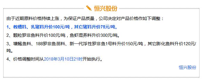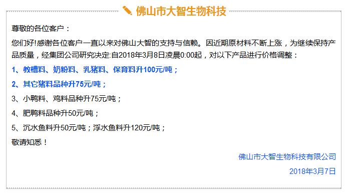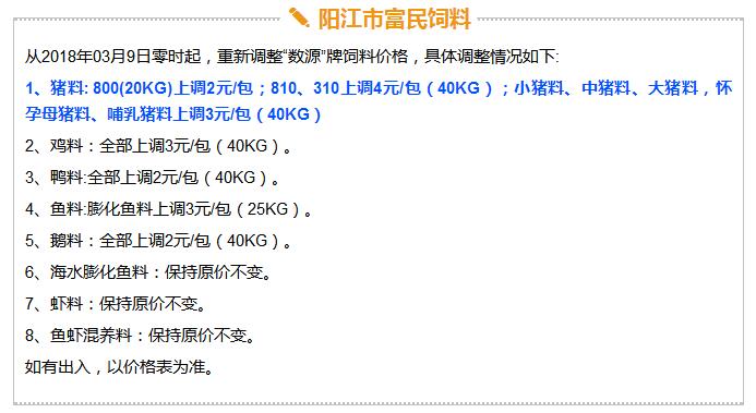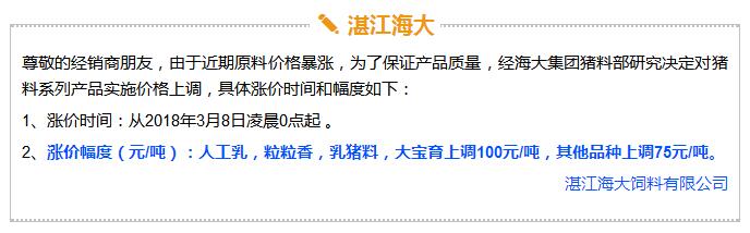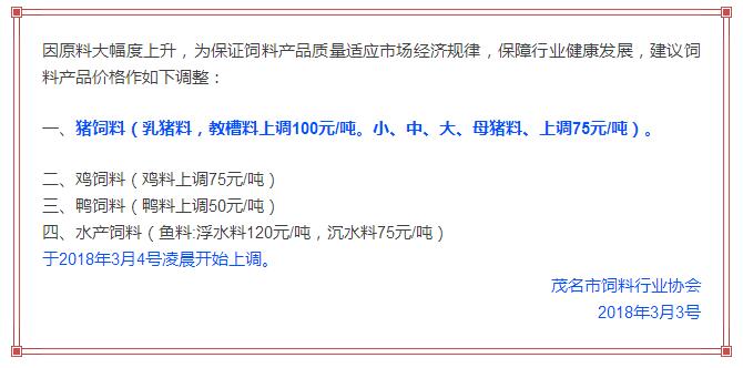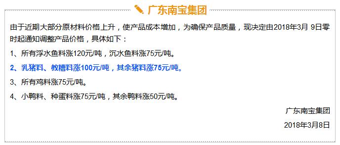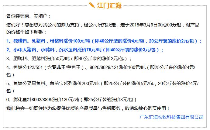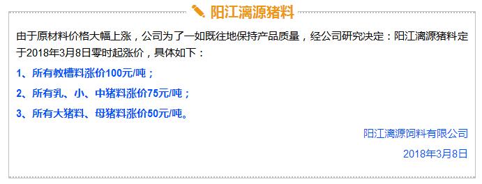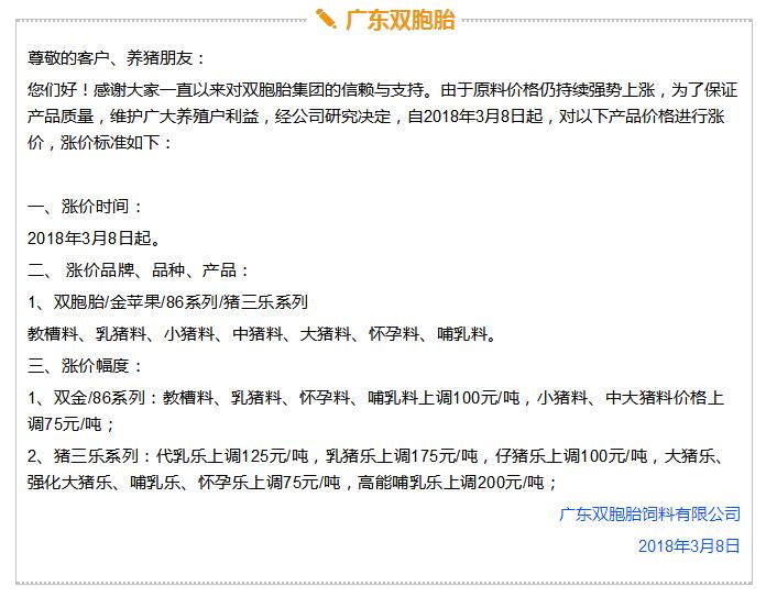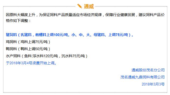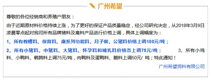 年后豬價大跌,飼料價格上漲,這是自2017年11月之后飼料行業再次迎來漲價潮,主要原因是玉米豆粕價格上漲。業內人士預測如果豆粕等原料價格繼續上調,接下來珠三角很可能也會掀起第二輪漲價潮。 雙胞胎、海大、中糧、漓源等數十家企業宣布漲價!接下來還會漲? 《農財寶典》記者 許婉 蘇若晶 農歷狗年剛過,豬價就經歷了一段令人瞠目結舌的下跌,從農歷大年初七(2月22日)的6.46元/斤下跌到3月8日的5.62元/斤,新牧網豬價指數也跌破100點大關,而上次破百還是在2014年12月。 與豬價大跌形成鮮明對比的是飼料價格上漲。這是自2017年11月之后飼料行業再次迎來漲價潮,真是“屋漏偏逢連夜雨,船慢又被打頭風”啊。 2月27日,雙胞胎宣布豬料漲價25-75元/噸,金新農漲價100-200元/噸,唐人神漲價50元/噸。正邦早在2月6日就宣布漲價。海大也在口頭上通知漲價。(相關報道:雙胞胎、海大、唐人神、金新農飼料率先漲價,不少企業表示要跟漲!) 雙胞胎和海大一直是飼料價格的風向標。《農財寶典》當時預測,繼雙胞胎和海大漲價之后,會有一大堆飼料企業跟著漲起來,飼料即將進入全線漲價的局面。 果不其然,3月3日,廣東茂名飼料行業協會發出漲價通知,其中禽料上調50-75元/噸,豬料上調75-100元/噸,水產飼料上調75-120元/噸。 緊接著茂名通威、茂名中糧等公司相繼發出漲價通知,漲價幅度與茂名協會發出通知幾乎一致;據經銷商反映,茂名海龍(海大集團子公司)也在3月3日晚上口頭通知漲價,但是茂名海龍主管回應《農財寶典》記者時表示,還沒確定漲價日期,但是會跟隨行業上漲;茂名六和、茂名恒興也開始計劃漲價。可以說,在行業協會以及大企業的帶動下,粵西地區飼料掀起漲價潮。 據《農財寶典》相關報道,2017年11月24日茂名地區率先漲價,可謂是引爆華南飼料全線漲價的一顆重磅炸彈。 此次第二次率先漲價也是如此,緊著著各大企業飼料應聲上漲,廣東地區的雙胞胎、恒興、海大、廣州希望、漓源、富民、匯海、南寶等公司均宣布飼料價格上調。(文末附各廠家飼料具體漲價信息) 豆粕、玉米價格上漲引發本次漲價潮 本次飼料漲價原因在于玉米、豆粕價格上漲。 據《農財寶典》記者了解,上次飼料漲價的導火線是因為魚粉價格快速上漲,從2017年10月中10400-10600元/噸上漲至12400-12600元/噸,豆粕基本維持在2900元/噸; 而到3月初,魚粉價格達到13800-14200元/噸,又上漲200元/噸;豆粕連日暴漲,達到3180-3280元/噸,不到半個月上漲了300-400元/噸,玉米價格也快速上漲至1880元/噸。 中糧飼料有限公司采購管理中心采購副總監兼能量原料采購部總經理王康易告訴《農財寶典》新牧網記者,國家糧油信息中心近日發布的玉米年度供需報告顯示,2017/2018年度中國玉米結余量近7年首次轉負,缺口高達2561萬噸。出現供需缺口主要在于玉米飼料和深加工需求增加。雖然我國現在還有1億多噸玉米庫存,但是按照往年,要到5月份才大量拍賣。2561萬噸的缺口,也是推動近期玉米漲價的重要原因之一。 至于豆粕漲價,行業人士認為原因在于中美的貿易戰。2月16日,美國商務部公布了對進口鋼鐵和鋁產品的安全調查報告,建議對中國等國征收高額關稅,而美國大豆協會則發布聲明,怕中國把大豆作為報復的目標。中美之間的貿易戰推高了豆粕的價格。此外,南美阿根廷干旱天氣來襲,也對豆粕價格形成有力支撐。 此外,因受各方面因素影響,維生素、礦物質等添加劑從去年到現在也一直處于上漲趨勢,某飼料企業高管表示,目前添加在飼料中的添加劑成本比去年平均成本高10多塊錢一噸。 面對全國各個市場此起彼伏的飼料漲價潮,很多人表示看不懂,非常混亂。據《農財寶典》記者了解,這是主要因為跟全國各地飼料價格不一樣,全國各地的銷售模式、養殖模式、市場習慣都不相同,所以飼料價格都不一致,加上各地飼料賒銷大、價格非常不透明、信息封閉性強,因此全國各地飼料價格不但漲價時間不一致,而且漲幅也不相同。 相比前幾年華南地區飼料價格戰此起彼伏,這兩年華南地區飼料價格是漲價頻率最快的市場。近日,粵西地區市場飼料掀起第二輪漲價潮,在茂名飼料協會宣布漲價后,中糧、海大、通威、粵海、恒興、匯海、南寶、雙胞胎等企業均宣布飼料價格上調,豬料、水產料、禽料全線上漲。 這次繼上一輪價格調整只有3個月左右時間,如果豆粕等原料價格繼續上調,接下來珠三角很可能也會掀起第二輪漲價潮。 各飼料廠具體漲價信息 |