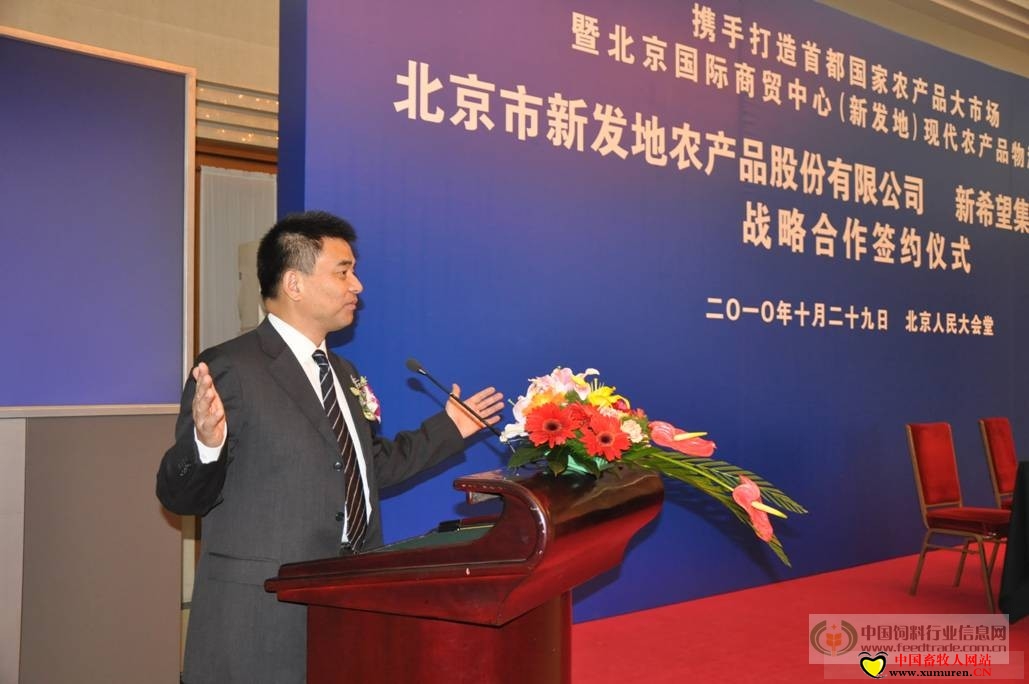 新希望集團有限公司董事長劉永好發言 劉永好在發言中強調,在農業轉型的關鍵時期,新希望集團作為全國最大的肉蛋奶生產商之一和全國最大的農產品交易市場——新發地的結合將使得產業鏈更長、更圓滿。眾所周知,“三農”乃是國家重中之重問題,國家已連續發7個一號文件來解決三農問題。一方面,三農問題是居民關注的焦點,肉蛋奶、糧食、蔬菜價格和居民生活息息相關。另一方面,國家和政府提出農業轉型,讓居民吃上價廉物美的商品。新希望集團已有7家國家級的農業產業化的龍頭企業聯合,去年以700億元的銷售額,今日再次和新發地聯合,共有8家農副產品企業精誠合作。新希望經過29年的發展已經成為中國最大的肉、禽產業鏈的生產企業之一。現在已經具備了超過7.5億只肉雞和鴨生產加工。超過750 萬頭豬的生產流通體系。2009年以500多億的銷售來回報社會和市場。2009年新發地市場銷售了90億公斤的水果蔬菜。約300多億元的銷售業績,保證食品安全和物美價廉。通過科學規范上百萬農民科學養豬、養雞、養牛為市場提供健康、環保、豐富多樣地肉蛋奶產品。為社會、為國家、為人民作出一定的貢獻。新希望和新發地兩家結合將為使我們的為農產業、為城市人民作貢獻。 他強調,新希望和新發地的合作將以“新希望、新發地”為導向,以新的理念、新的模式、新的措施、新的格局為城市居民、為農民,為國家,為企業走向世界作出應有的貢獻。另外,新希望和新發地的結合還是一個資本的結合。最近新希望聯合參股了一系列農業類的企業,通過資本的紐帶來規范的運作體系,以資本市場的結合,使得更多的企業在農產品、農產業和農業企業能夠得到快速地發展,并為企業在轉型方面作出貢獻。最重要的在于,讓農民增收,讓城市居民能夠消費價廉物美的、豐富多樣的肉蛋奶產品。
