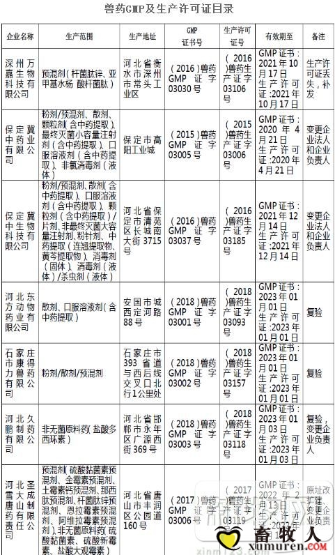 根據《獸藥管理條例》和《獸藥生產質量管理規范》,經審核深州萬嘉生物科技有限公司、保定冀中藥業有限公司、保定冀中生物科技有限公司、河北東方動物藥業有限公司、石家莊市康得力獸藥有限公司、河北久鵬制藥 ...