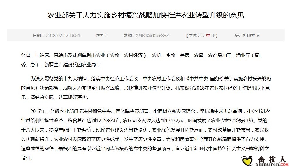 2月中旬,農業部發布《關于大力實施鄉村振興戰略加快推進農業轉型升級的意見》,要求大力實施鄉村振興戰略、加快推進農業轉型升級、扎實做好2018年農業農村經濟工作,其中多處對養豬業發展都有指導性意義。 ...