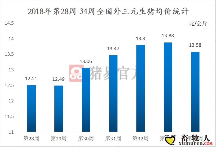 本周是2018年第34周(8月20日-8月26日)全國外三元生豬均價為13.58元/公斤,相比上周(13.88元/公斤)下跌0.3元/公斤,跌幅2.16%。 圖表一 2018年第28周-34周全國外三元生豬均價統計圖(單位:元/公斤) ( ...