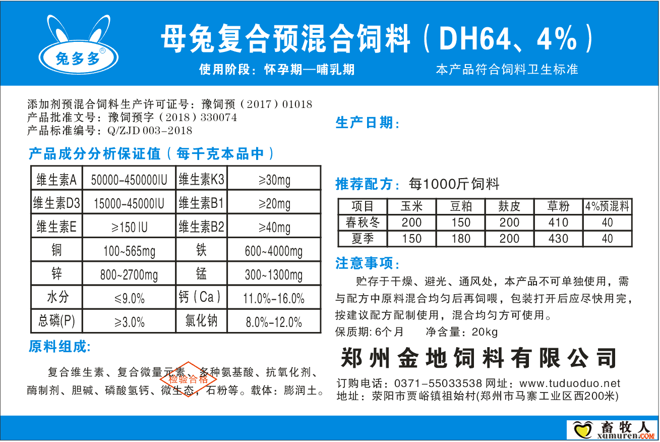 兔多多原料組成:復合維生素、復合微量元素、多種氨基酸、抗氧化劑、酶制劑、膽堿、磷酸氫鈣、微生態、石粉等。載體:膨潤土。 推薦配方:(種繁殖階段) 項目玉米豆粕麩皮草粉預混料春秋冬20015020041040夏季15 ...