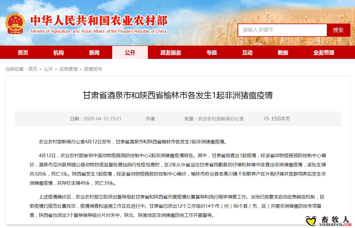 正文摘要:甘肅省酒泉市和陜西省榆林市各發(fā)生1起非洲豬瘟疫情 日期:2020-04-12 19:21來源:農(nóng)業(yè)農(nóng)村部新聞辦公室 農(nóng)業(yè)農(nóng)村部新聞辦公室4月12日發(fā)布,甘肅省酒泉市和陜西省榆林市各發(fā)生1起非洲豬瘟疫情。 4月12日,農(nóng)業(yè) ... |
