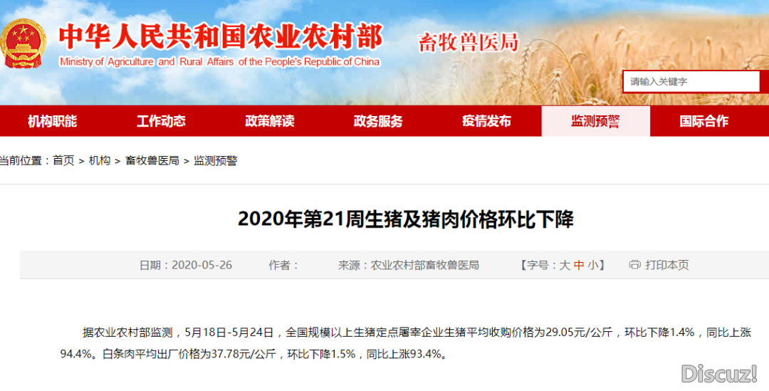 關于2020年5月27日中央儲備凍豬肉投放競價交易有關事項的通知 2020年第21周生豬及豬肉價格環比下降 日期:2020-05-26來源:農業農村部畜牧獸醫局 據農業農村部監測,5月18日-5月24日,全國規模以上生豬定點 ...