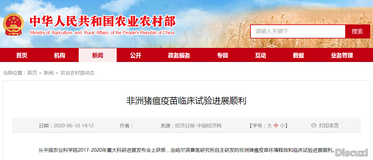 非洲豬瘟疫苗臨床試驗進展順利 日期:2020-06-10 14:12 來源:經濟日報-中國經濟網 從中國農業科學院2017-2020年重大科研進展發布會上獲悉,由哈爾濱獸醫研究所自主研發的非洲豬瘟疫苗環境釋放和臨床試驗進展順 ...