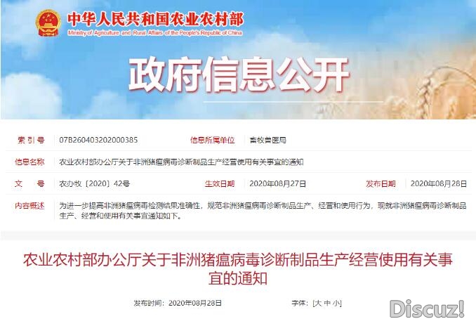 ​農業農村部官網28日發布《關于非洲豬瘟病毒診斷制品生產經營使用有關事宜的通知》指出,自2020年9月1日起,所有未參加或未通過中國動物疫病預防控制中心比對試驗的非洲豬瘟病毒診斷制品,以及通過比對試驗但 ...