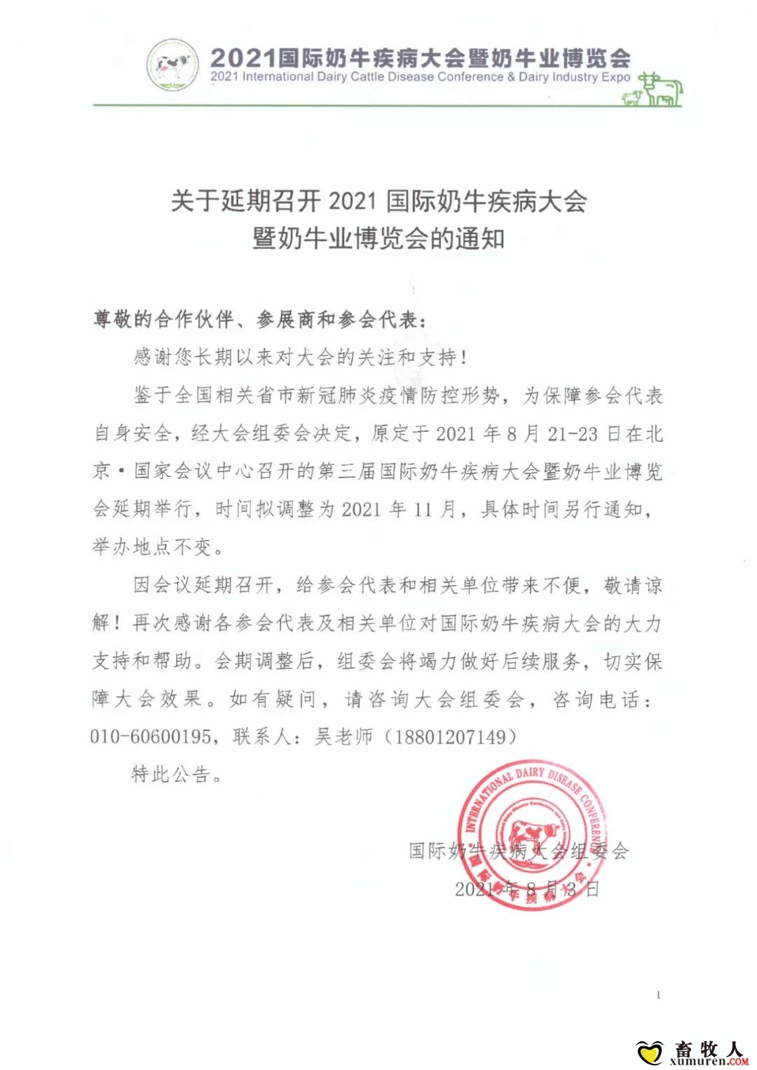 2021國際奶牛疾病大會暨奶牛業博覽會2021年11月北京·國家會議中心 關于延期召開2021國際奶牛疾病大會暨奶牛業博覽會的通知 尊敬的合作伙伴、參展商和參會代表: 感謝您長期以來對大會的關注和支持! 鑒于全國相 ...
