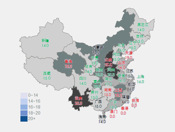 正文摘要:replyreload += ',' + 2740594;修改了一本書中資料的excel模板,制作成了全國(guó)和山東省的價(jià)格分布。 顏色深淺表示價(jià)格高低; 有多種顏色可供選擇; *可顯示/隱藏標(biāo)簽、數(shù)值; 標(biāo)簽紅色表示比昨日價(jià)格高; 綠色表示比 ... |