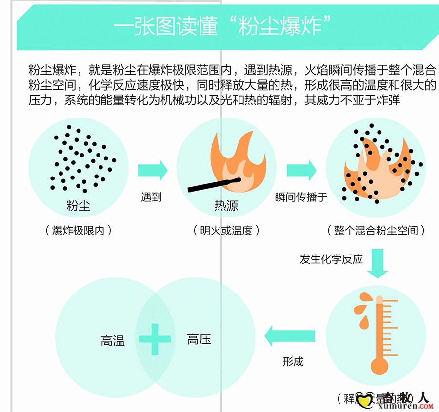 正文摘要:一張圖讀懂“粉塵爆炸” 粉塵為什么會發(fā)生爆炸? 原來是由于懸浮在空氣中的粉塵燃燒,而形成的高氣壓所造成的。專家指出,粉塵的表面積與同量的塊狀物質(zhì)相比要大得多,故容易著火。如果它懸浮在空氣中, ... |
