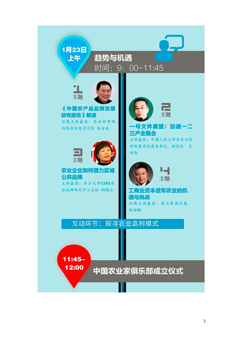 2015中國農業家年會暨首屆中國農業食品電商峰會邀請函 活動名稱 2015‘中國農業家年會暨首屆中國農業食品電商峰會 主辦單位: 中國農業家俱樂部、品牌農業與市場雜志 支持單位 中國食品土畜進出口商會 糖煙酒周刊雜志社 中國品牌農業發展研究院 中國人民大學農業與農村發展學院 北京新發地農產品股份有限公司 中國生態三農產業聯盟 派代網 活動主題 農業家 創未來 活動宗旨 助力中國農業家群體形成和發展,加速中國農業現代化進程,推廣品牌農業生產經營方式,構建農業資源配置平臺。 活動時間 2015年1月22日-24日 活動地點 北京萬達索菲特大酒店(北京市朝陽區建國路93號) 主要參會對象 農業主管部門領導 農業企業董事長、總經理 大型農業商業企業董事長、總經理 農業電商、商超采購負責人 農業投資專家、智業專家 農資、農業配套服務企業負責人 會議議程 1月22日 全天報到 1月22日 19:00-21:00 中國農業家俱樂部籌備會 2015′中國農業家年會 參會報名表