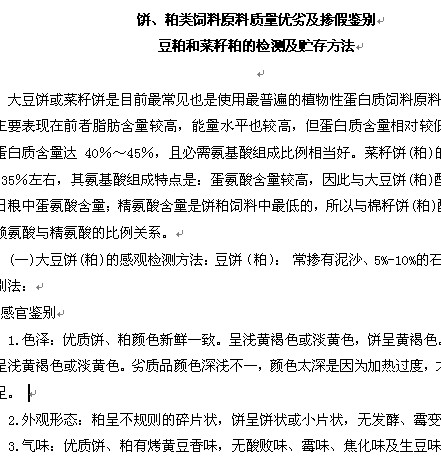 內容介紹:大豆餅或菜籽餅是目前最常見也是使用最普遍的植物性蛋白質 飼料原料。餅、粕間的區別主要表現在前者脂肪含量較高,能量水平也較高,但蛋白質含量相對較低。大豆餅(粕)的蛋白質含量達40%~45%,且必需氨基酸組成比例相當好。菜籽餅(粕)的蛋白質含量也在35%左右,其氨基酸組成特點是:蛋氨酸含量較高,因此與大豆餅(粕)配合使用可以提高日糧中蛋氨酸含量;精氨酸含量是餅粕飼料中最低的,所以與棉籽餅(粕)配合使用,可改善賴氨酸與精氨酸的比例關系。下載地址: 餅、粕類飼料原料質量優劣及摻假鑒別